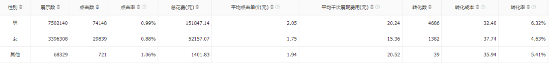 看过这7条top计划的数据,发现女性成本普遍高于男性10%以上。这个时候可以初步判断:女性用户确实转化率低于男性,成本高于男性。
