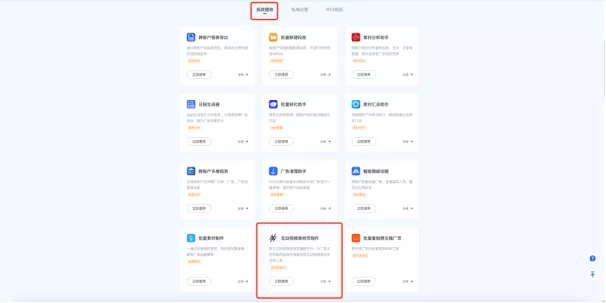 1.在工具栏找到并打开【营销服务市场】。在【广告营销工具】-【投放提效】-【互动视频落地页制作】点击【立即使用】,然后选择广告账户进行授权,即可进入互动视频广告落地页创作平台,创作和发布。(以下数据案例均来源于腾讯广告游戏营销顾问)